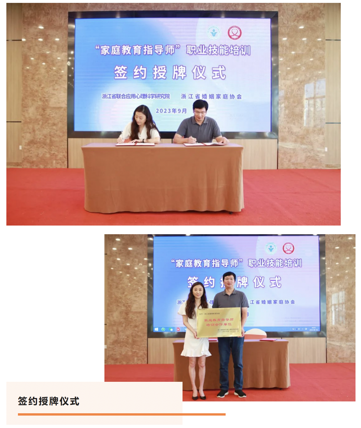 此外,活动上浙江省婚姻家庭协会与浙江省联合应用心理科学研究院还举行了“家庭教育指导师”职业技能培训合作签约授牌仪式,这是协会在专业培训领域的又一次拓展创新,标志着协会又获得一项专业招生培训资质。